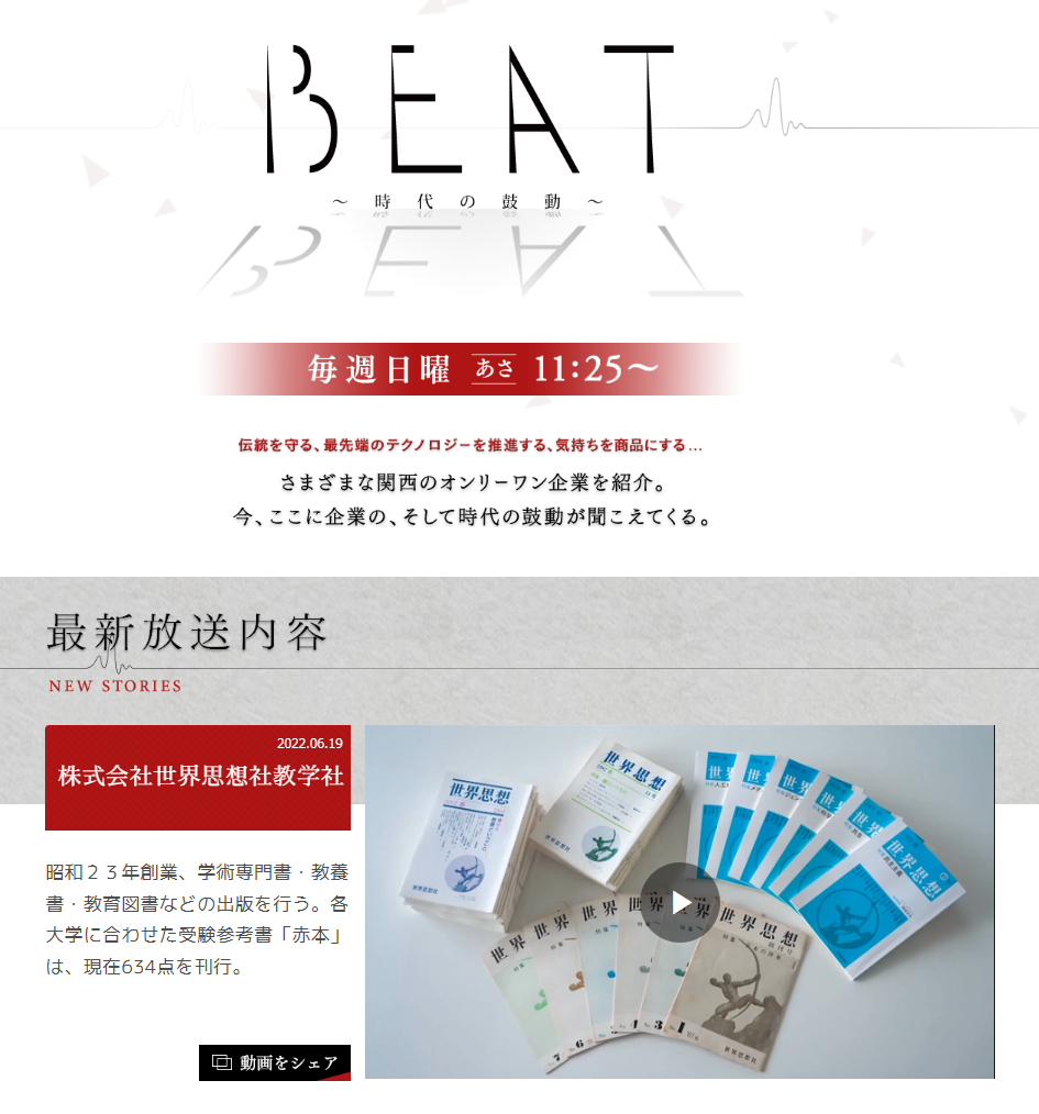 参考動画 これまでに放送された取材番組のうち、会社の様子が分かるものを掲載しています。 「BEAT~時代の鼓動~」読売テレビ(2022年放送) BEAT https://www.ytv.co.jp/beat/?bcid=6307748499112